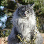 Misty is a beautiful black silver tabby girl with the most gorgeous green eyes. Misty was my first show cat and together we became hooked on showing this lovely breed. She was so delightful that we had a kitten from the next litter, and her brother Monty came to join us also. In the summer Misty turns into a shorthair cat and sheds her fur, but come the winter she sports a full Norwegian coat and looks spectacular in the snow. Misty has now retired from shows and spends her days enjoying the garden and watching the chickens!