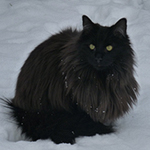 Monty is a solid black boy and is full brother to Misty from the next litter. He is the soppiest cat ever and he gets on well with all our other moggies. Now 7 years old, he still sports the silvery 'kitten' fur under his arms and in his ruff. Being black he is very hard to photograph but is in his element in the snow where he looks spectacular!