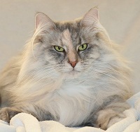 Tink is our first queen under our prefix of KattJewels. Tink is a very confident girl who stole our hearts from day one! She is a blue silver tortie with a very attractive cream blaze on her nose. She has had a very successful show career as a kitten and this has continued into her adult career, gaining the title Champion in three straight shows and then Grand Champion in two show weekends! She has had superb show write-up's and several Best of Variety wins plus an Overall Best in Show at the Norsk Skogkatt Show 2012. She took a break from the show bench to have her first beautiful litter of kittens with Gizmo but is back on the show circuit now and much to our delight gained her Imperial title at the Norsk Skogkatt Show in Oct 2013 and was also Best in Show Adult Female. She made us very proud winning 2 Olympian Certificates in 2014. Sadly she had to be neutered immediately following her 2nd litter and we lost all the babies except for Oscar, whom we have kept. Tink's show success continues, repeating Overall Best in Show at the Norsk Skogkatt Show in 2015 and Best in Show Female Neuter at the Norwegian Forest Cat Club Show in 2016. We are just happy she is still with us and will enjoy life as a happy neuter because we just adore our beautiful lady!